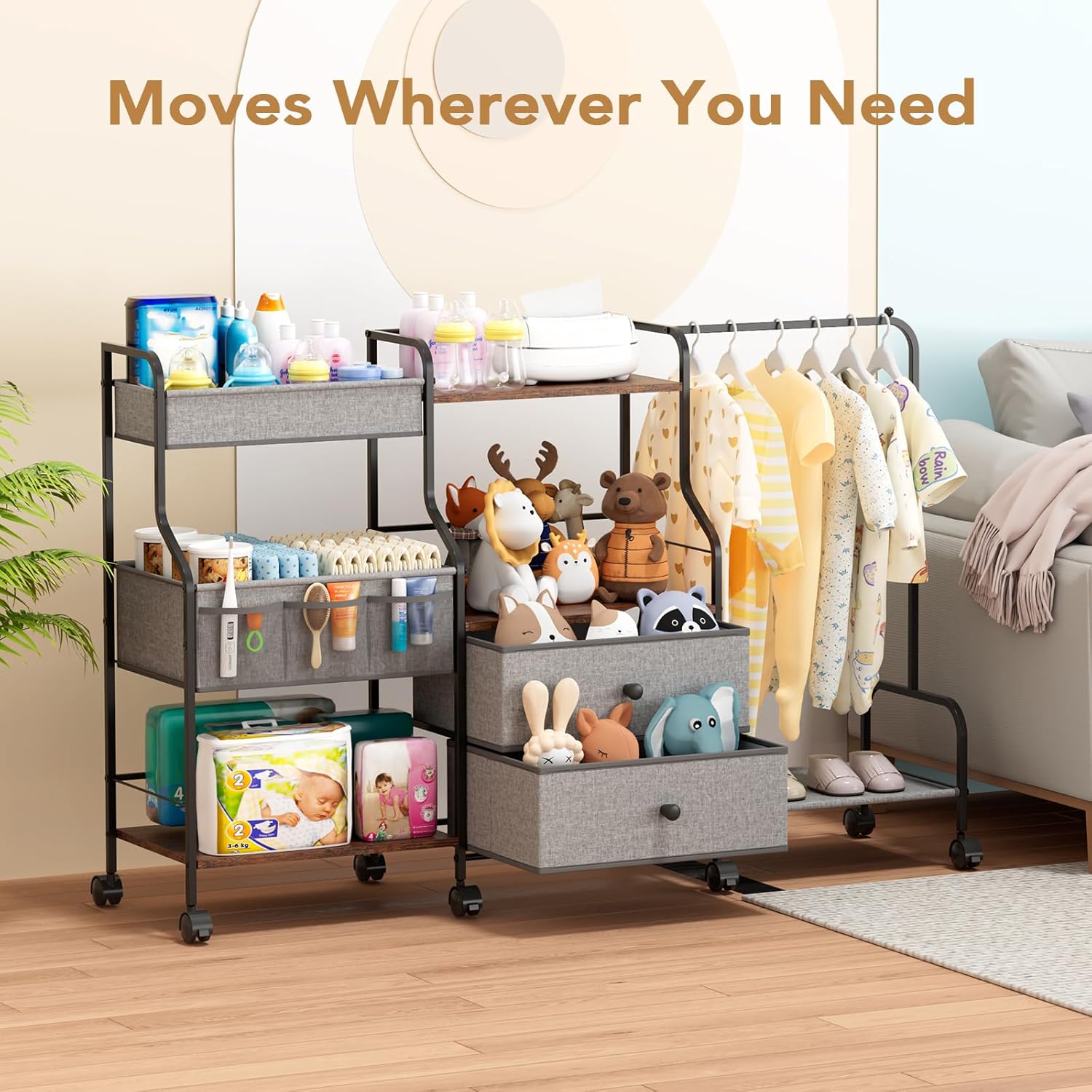 [All-in-One Diaper Station] Simplify baby care with our rolling diaper caddy that combines drawers, open shelves, hanging rack, and side pockets in one compact solution. Keep all your baby essentials—diapers, bottles, wipes, and clothing—neatly stored and accessible at any time without clutter