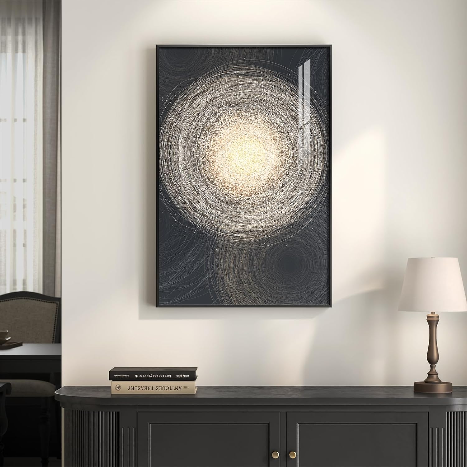 [Modern Abstract Wall Art]: This elegant wall art features a mesmerizing abstract design in deep black and shimmering gold tones, with swirling circular lines radiating from a glowing center. The luminous golden details against the dark backdrop create a sense of depth, movement, and sophistication, bringing a luxurious yet modern atmosphere to any room. Perfect for the living room, bedroom, dining room, hallway, entryway, office, or lounge, this piece serves as a striking contemporary focal point that elevates your home decor