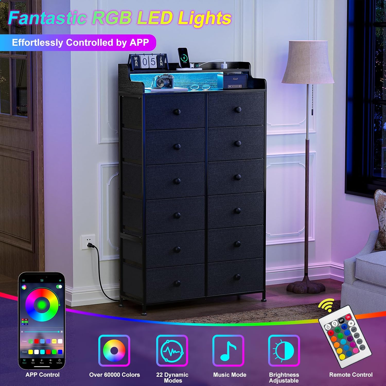 Unique Design: REAHOME dresser Equipped with a built-in power outlet and LED light, this dresser combines functionality and style. Built-in power outlets (2AC+2USB+1TC), allowing you to easily charge your devices without the need for extra extension cords. With over 60,000 DIY colors to choose from, allows you to control 21 dynamic modes, 8 speed modes, and 8 brightness modes. follow your mood meet your needs