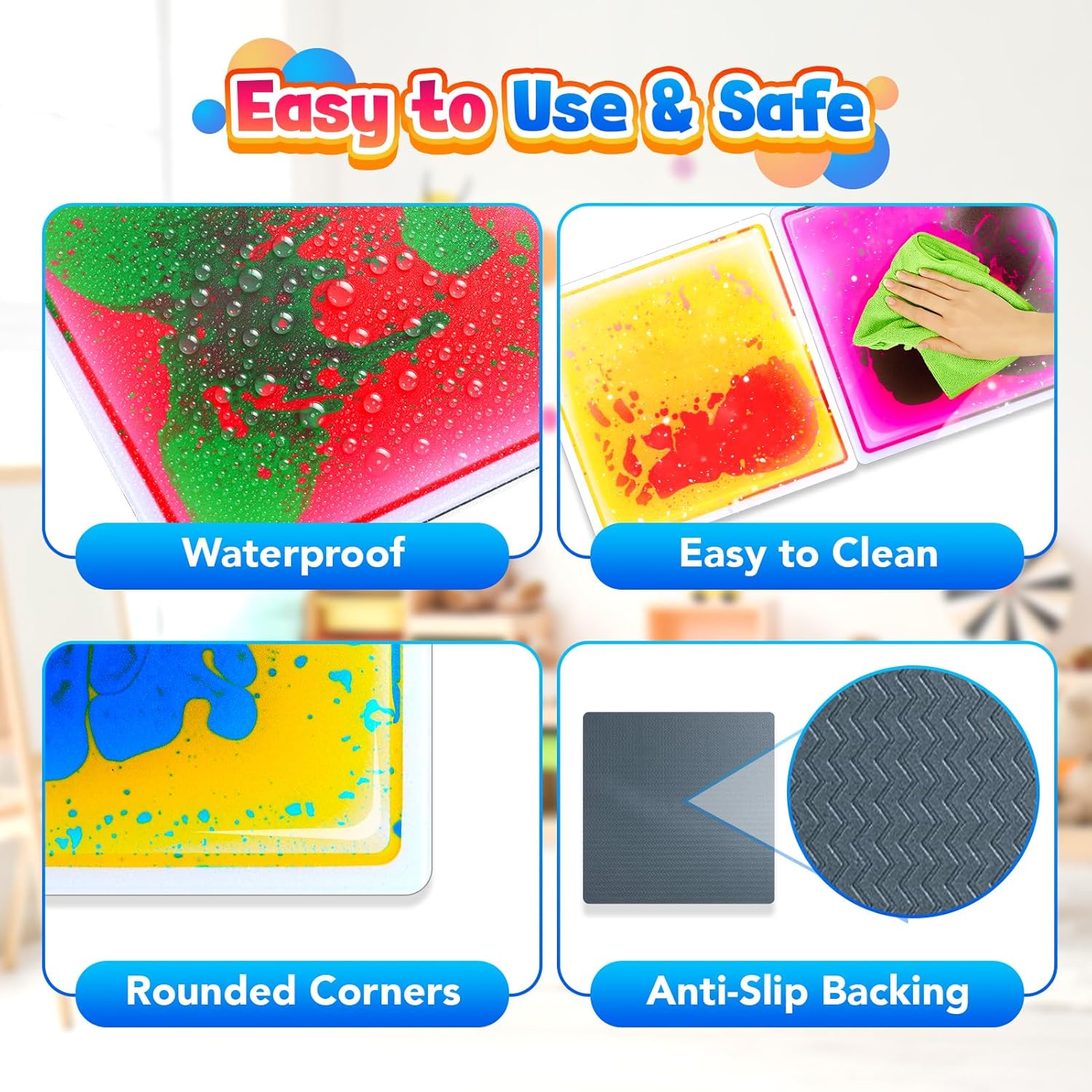 【Safe & Non-Toxic Sensory Tiles】Our liquid floor tiles are made with high-quality PVC surfaces and anti-slip back EVA bottoms, filled with cosmetic-grade liquid that’s non-toxic and leak-proof. Certified by US toy safety standards, these sensory pads mats tiles are ideal autism sensory products and autism learning materials, providing a safe sensory experience for kids while supporting their physical development.